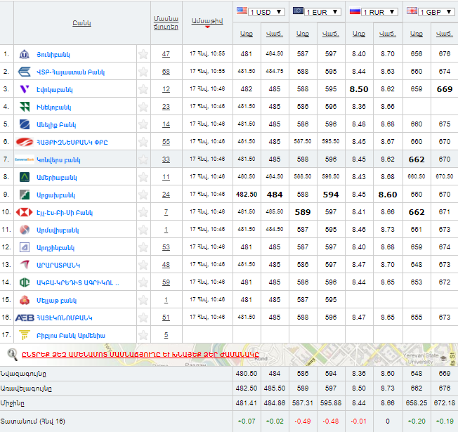 Ամերիկյան մեկ դոլարը գնվում է 480.50 դրամ նվազագույն և 482.50 դրամ առավելագույն փոխարժեքով, վաճառվում՝ 484 դրամ նվազագույն և 485.50 դրամ առավելագույն փոխարժեքով:
