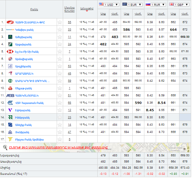 Ներկայացնում ենք Հայաստանի բանկերի կողմից գնվող և վաճառվող արտարժույթների փոխարժեքները հունվարի 18-ի դրությամբ՝ ըստ rate.am-ի: