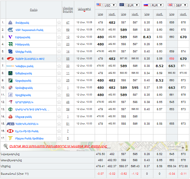 Ներկայացնում ենք Հայաստանի բանկերի կողմից գնվող և վաճառվող արտարժույթների փոխարժեքները մարտի 12-ի դրությամբ՝ ըստ rate.am-ի: