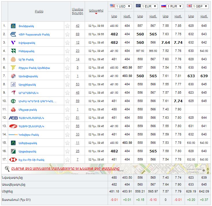 Ներկայացնում ենք Հայաստանի բանկերի կողմից գնվող և վաճառվող արտարժույթների փոխարժեքները հուլիսի 2-ի դրությամբ՝ ըստ rate.am-ի: