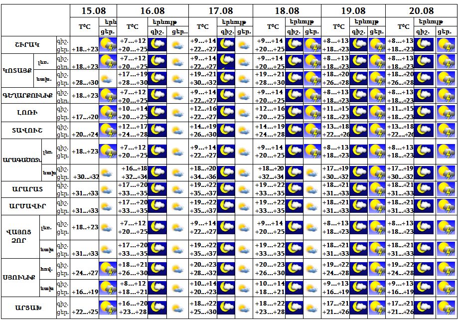 На территории Армении днем 15 августа, в вечерние часы 18 августа, особенно в северных районах, с 19 по 20 ночью и после полудня, ожидается дождь с грозой, в отдельных местах возможен град. С 16 по 17 августа ожидается погода без осадков.