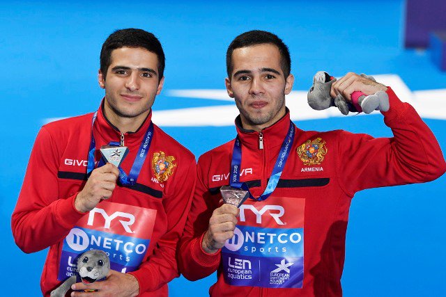 Следующся – неожиданная, победа – пара Владимир Арутюнян-Лев Саргсян, впервые в истории независимой Армении они завоевали бронзу в парных прыжках в воду на первенстве Европы в Глазго.