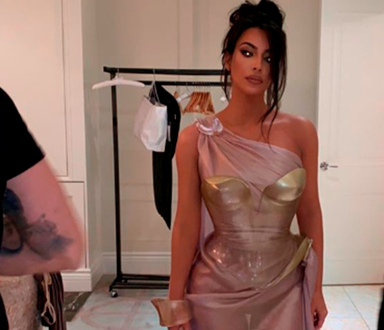 Кардашьян появилась перед публикой в лавандовом полупрозрачном наряде на одно плечо с золотым корсетом. Дополнила свой look супруга Канье Уэста широким браслетом в тон платью и прозрачными туфлями.