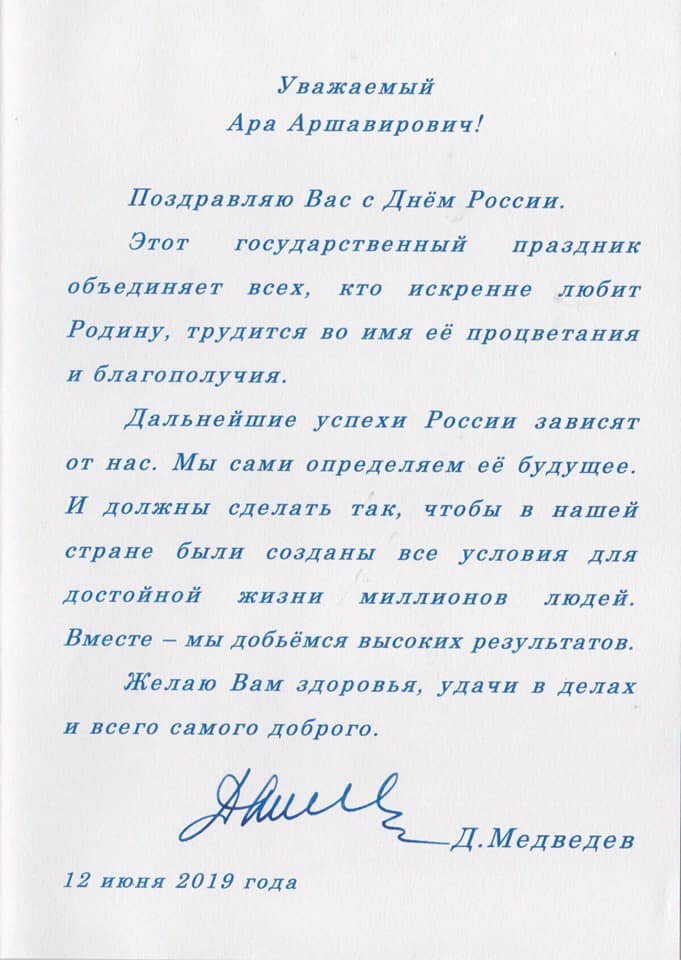 Председатель правительства Российской Федерации Дмитрий Медведев поздравил Ара Абрамяна с Днем России.