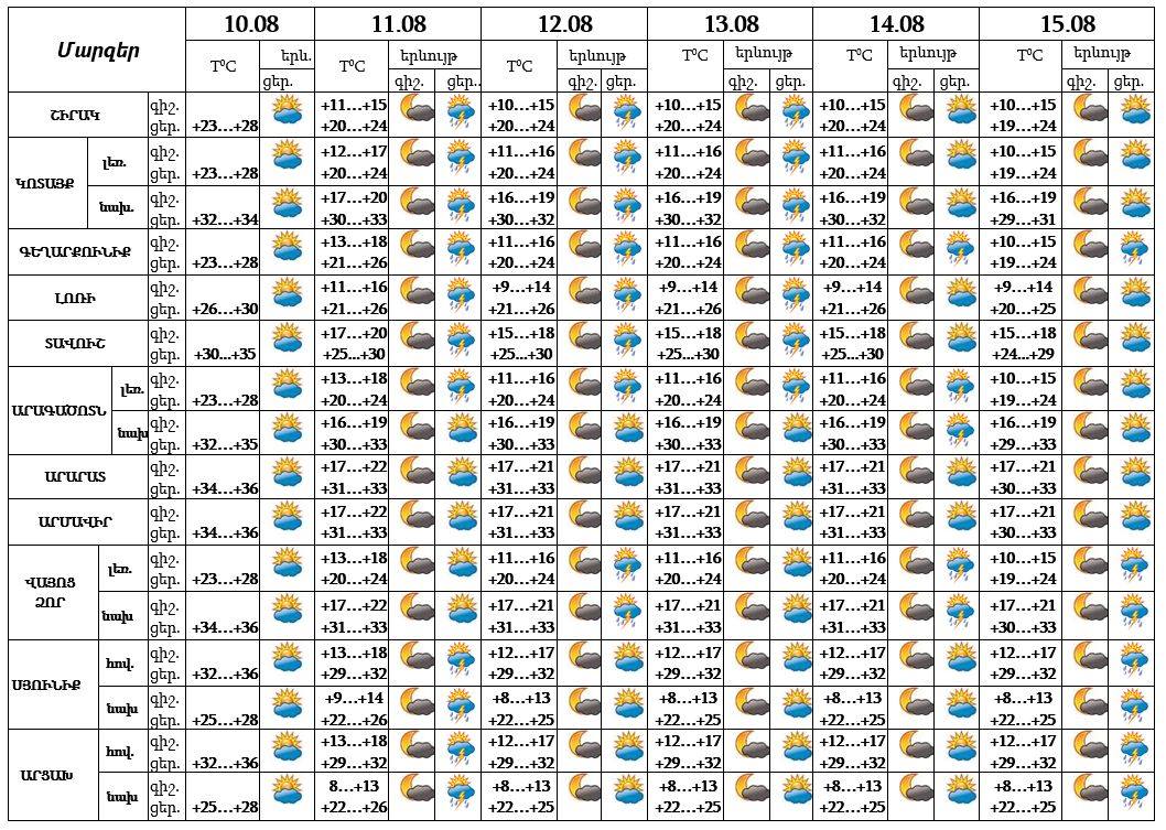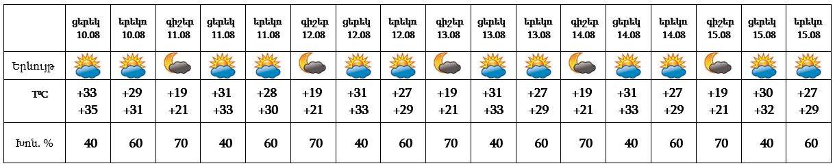 Հանրապետության տարածքում՝ oգոստոսի 10-ի ցերեկը սպասվում է առանց տեղումների եղանակ։ 11-15-ի առանձին շրջաններում կեսօրից հետո սպասվում է կարճատև անձրև և ամպրոպ, ամպրոպի ժամանակ քամու ուժգնացում՝ 20-25 մ/վ արագությամբ: Առանձին վայրերում սպասվում է նաև կարկուտ: