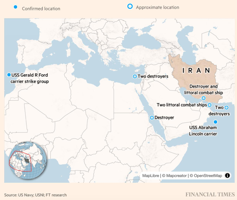 Առաջինում երևում են ԱՄՆ ռազմածովային ուժերի տեղակայումը Իրանի շուրջ, որոնք վերջին օրերին են տեղափոխվել տարածաշրջան։